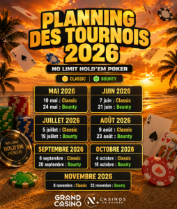 Les tournois débuteront à 14h, dans l’ambiance unique du Grand Casino. Que vous soyez joueur régulier ou amateur de belles parties, c’est l’occasion idéale de retrouver le plaisir du poker en tournoi et de tenter de vous distinguer face aux autres participants.
